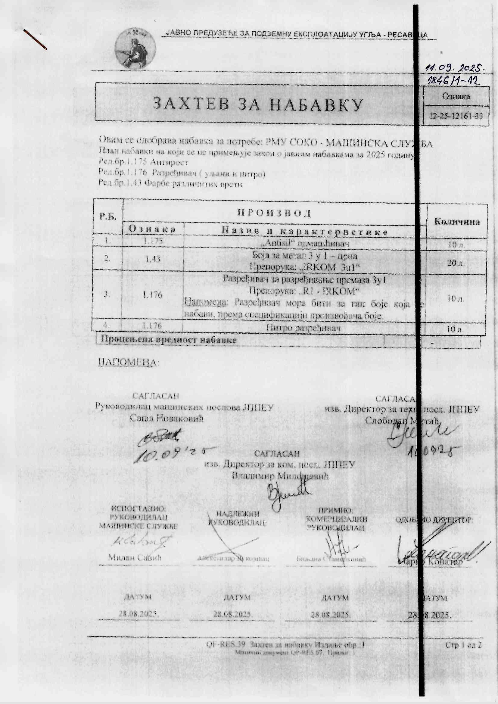Nabavka odmašćivača,boja i razređivača - RMU "Soko"
