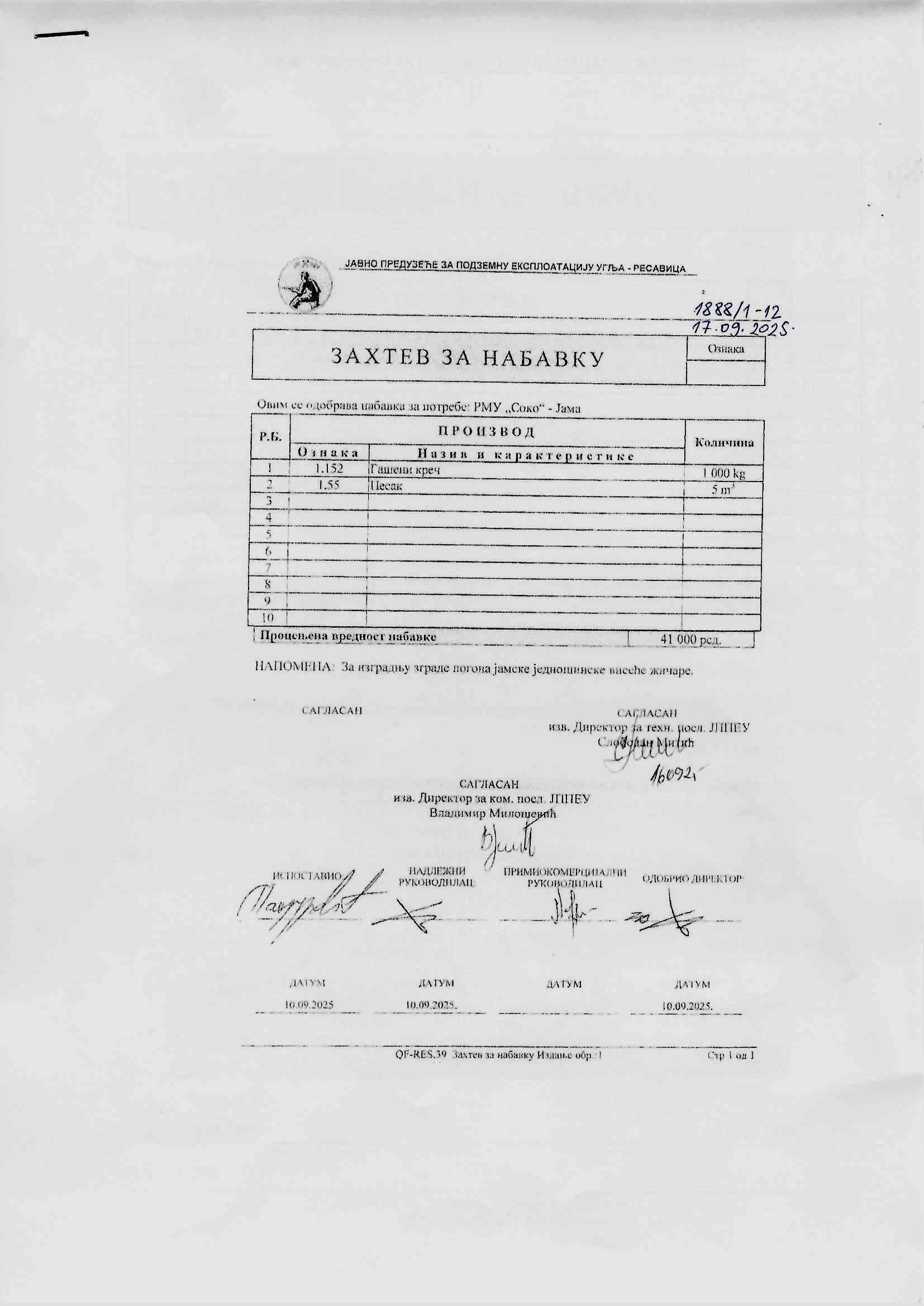 Nabavka gašenog kreča i peska - RMU "Soko"
