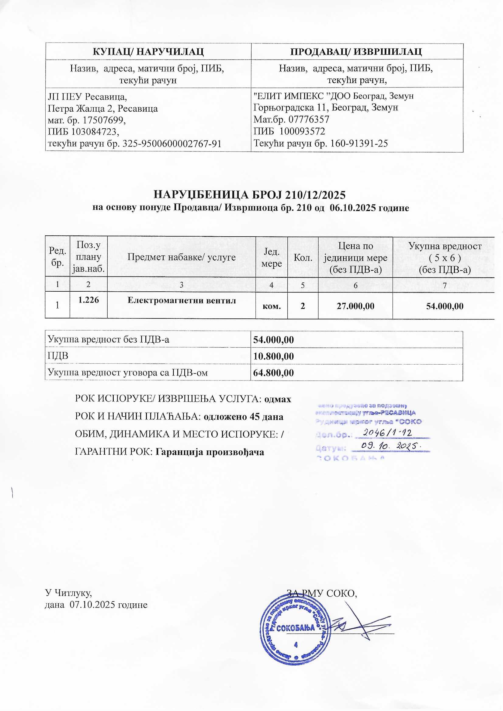 Nabavka elektromagnetnih ventila - RMU "Soko"