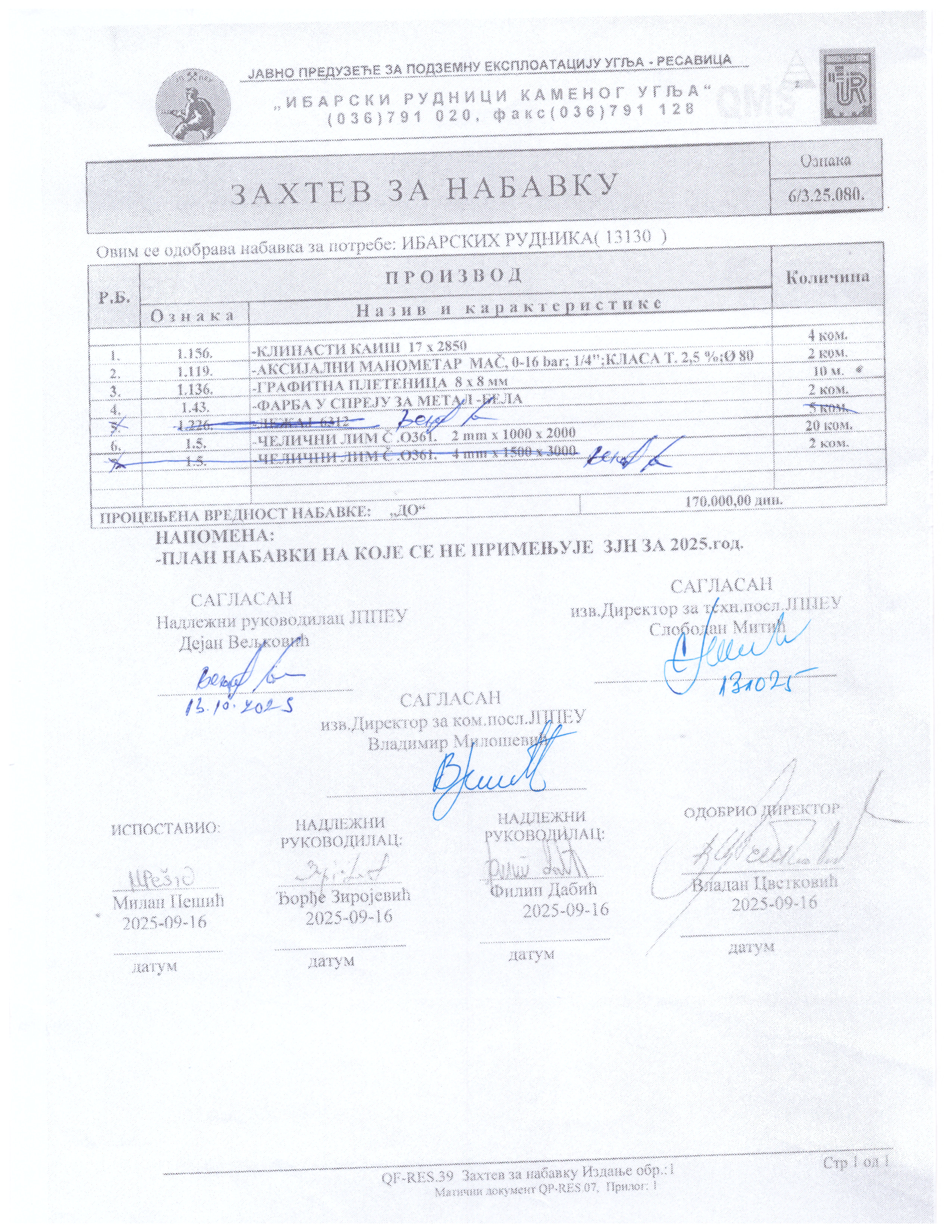 Клинасти каиш 17 х 2850 Аксијални манометар МАČ,0-16 bar; 1/4“; КЛАСА Т.2,5 %; фи 80 Графитна плетеница 8 х 8 мм Фарба У спреју за метал-бела Челични лим Č,O361. 2мм х 1000 х 2000