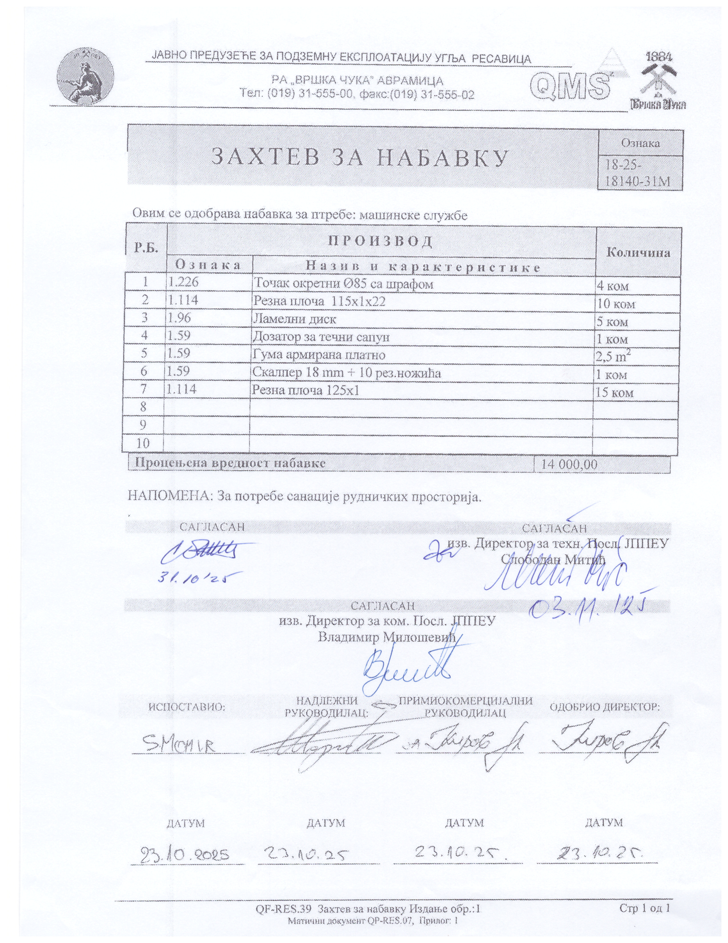 Точак окретни ф85 са шрафом ком 4 Резна плоча 115х1 ком 10 Ламелни диск ком 5 Дозатор за течни сапун ком 1 Гума армирано платно м2 2,5 Скалпер са ножићима ком 1 Резна плоча 125х1 ком 15