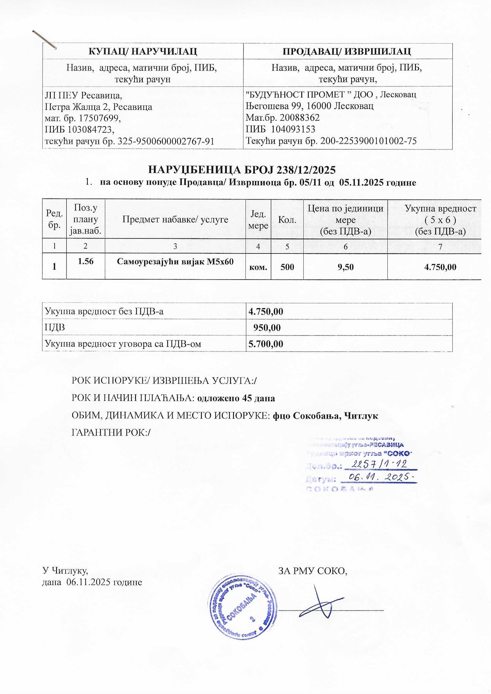 Nabavka samourezujucih vijaka (nabavka do 10.000,00 din.) - RMU "Soko"