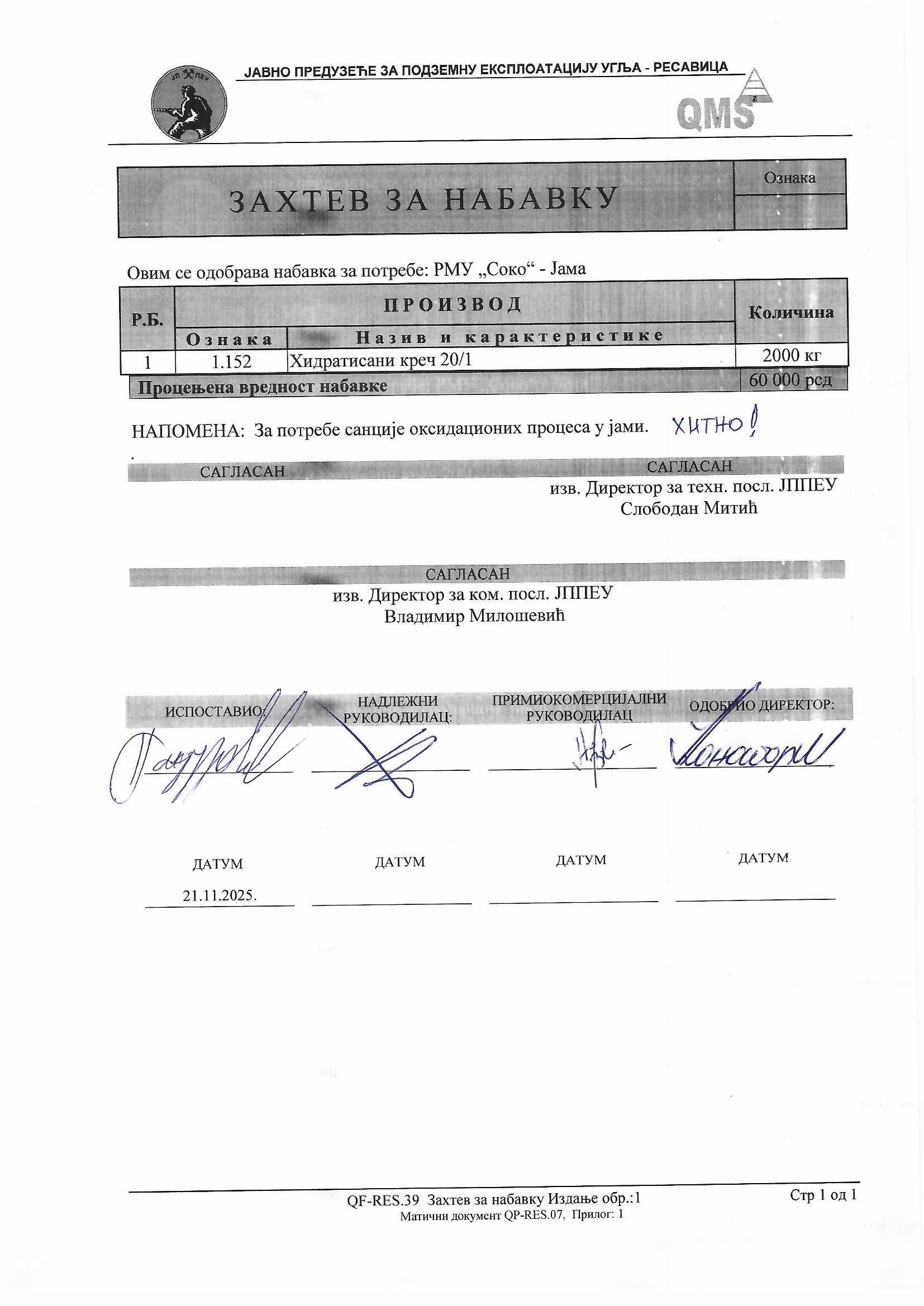 Nabavka hidatisanog kreča (hitno) - RMU "Soko"