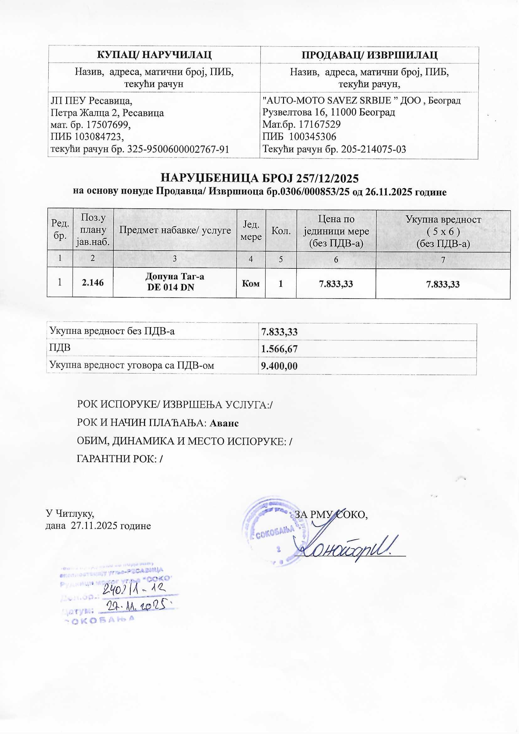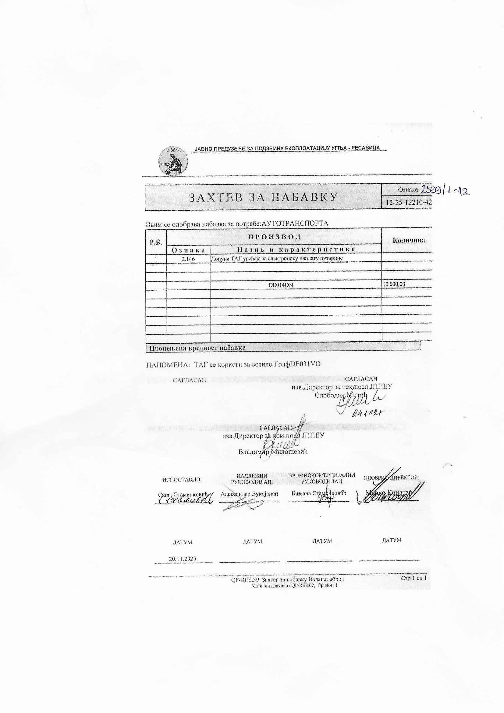Dopuna taga (nabavka do 10.000,00 din.) - RMU "Soko"