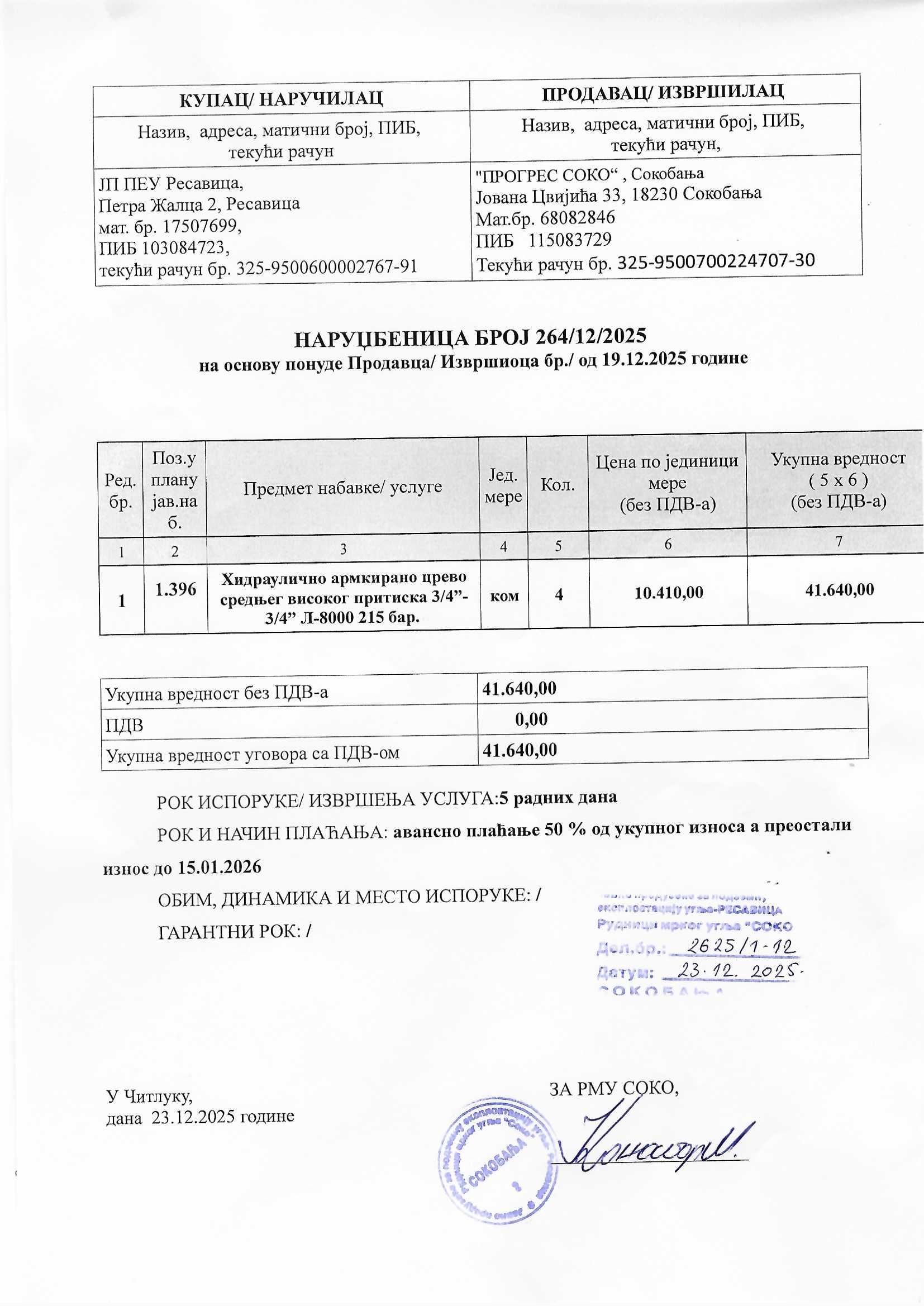 Nabavka hidraulicnog armiranog creva visokog pritiska - RMU "Soko"