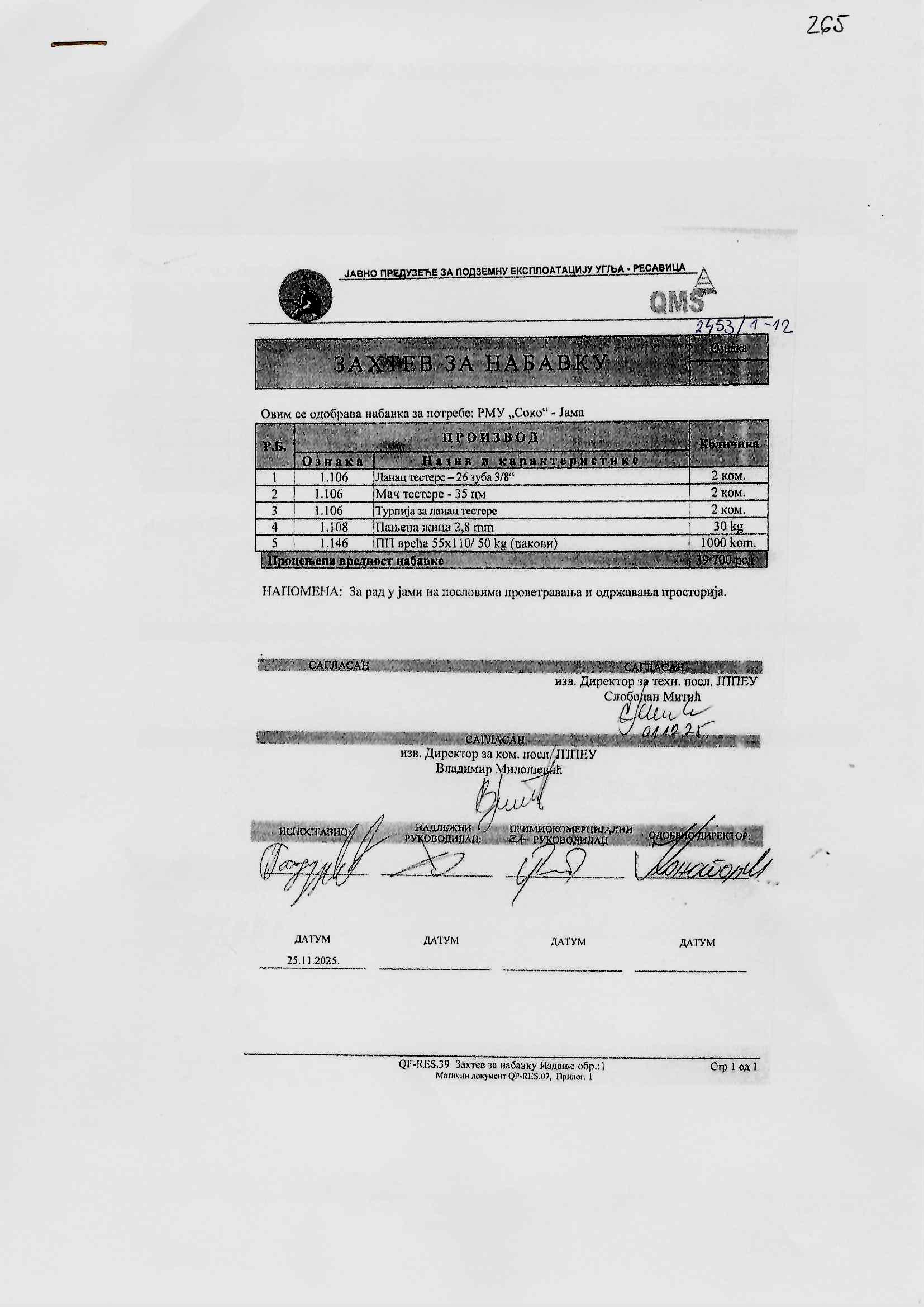 Zahtev za nabavku 265