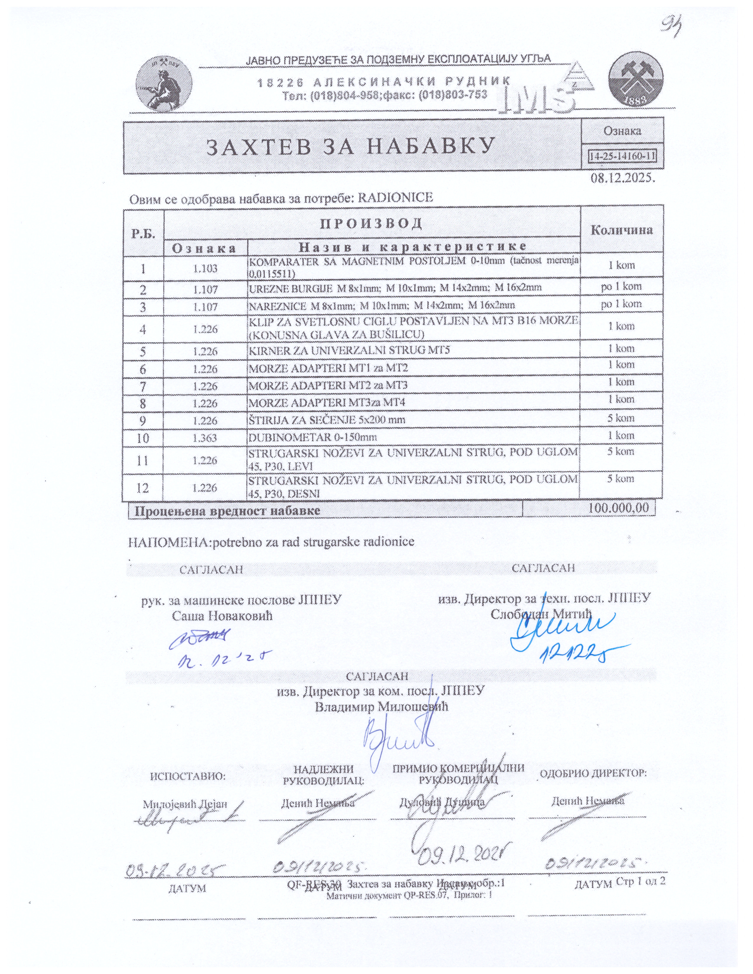 Razna roba za strugarsku radionicu - po zahtevu za nabavku