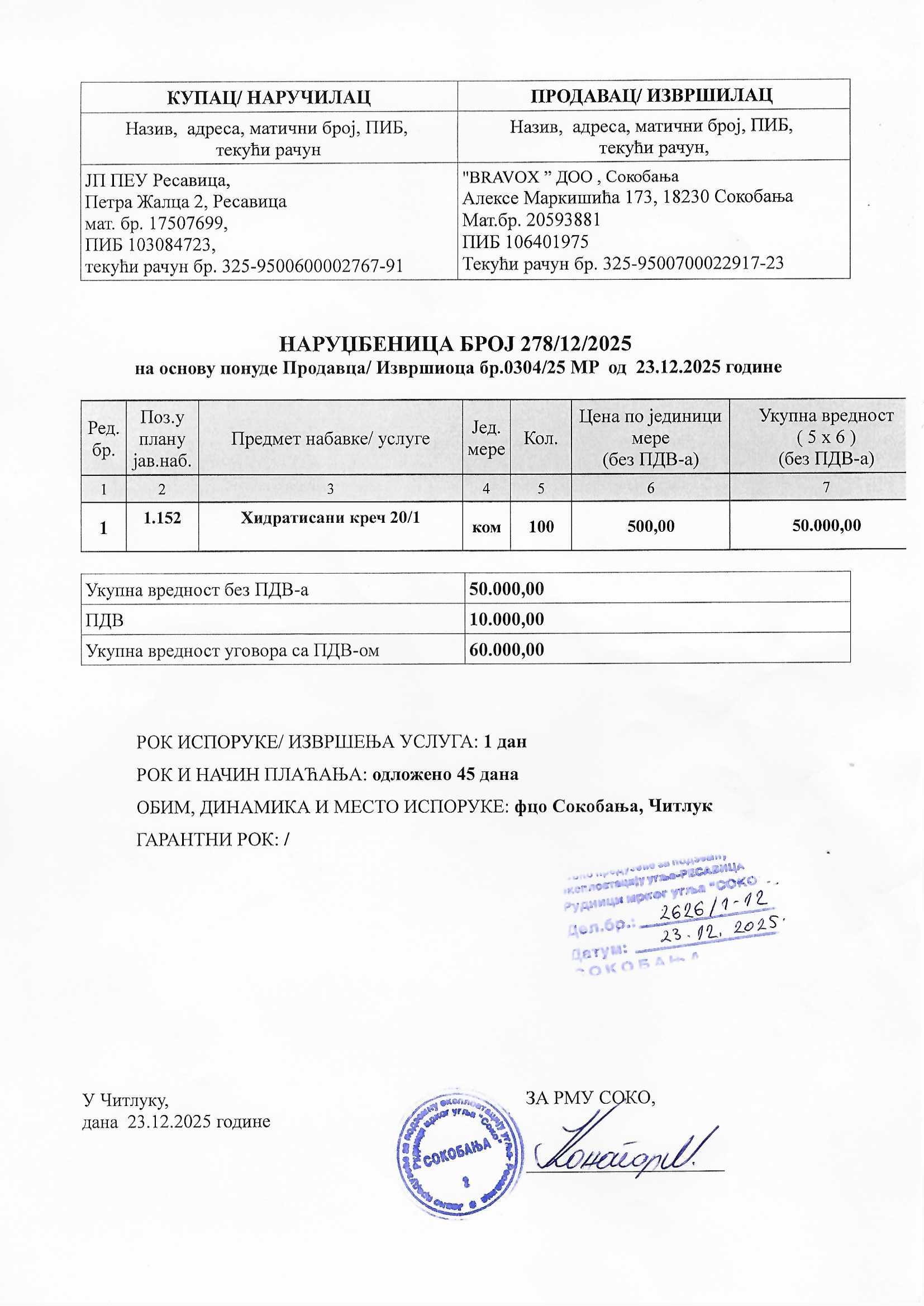 Nabavka hidratisanog kreča - RMU "Soko"