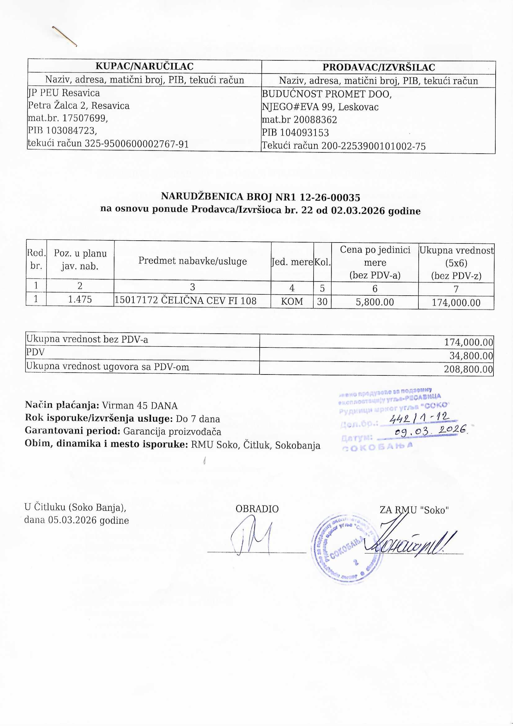 Nabavka okruglih šavnih cevi - RMU "Soko"
