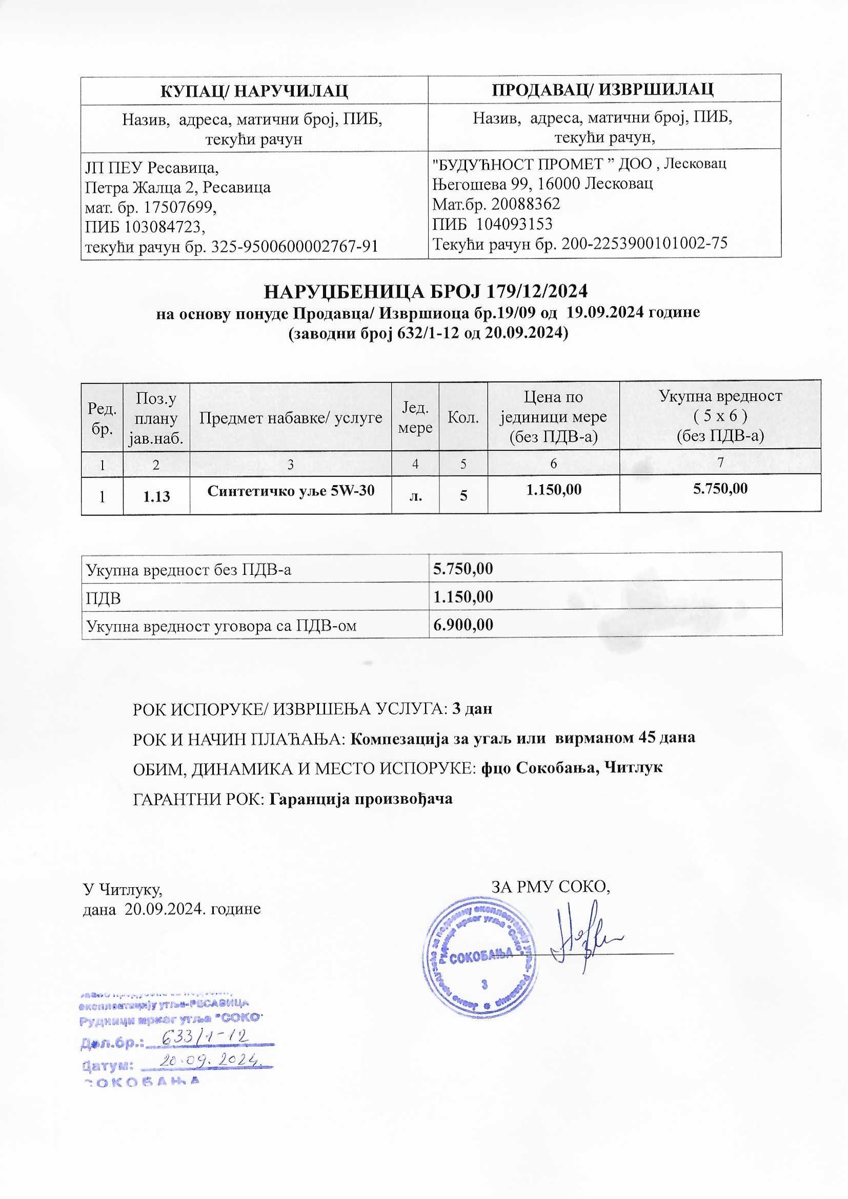 Nabavka sintetickog ulja 5W - 30 (nabavka do 10.000,00 din.) - RMU "Soko"